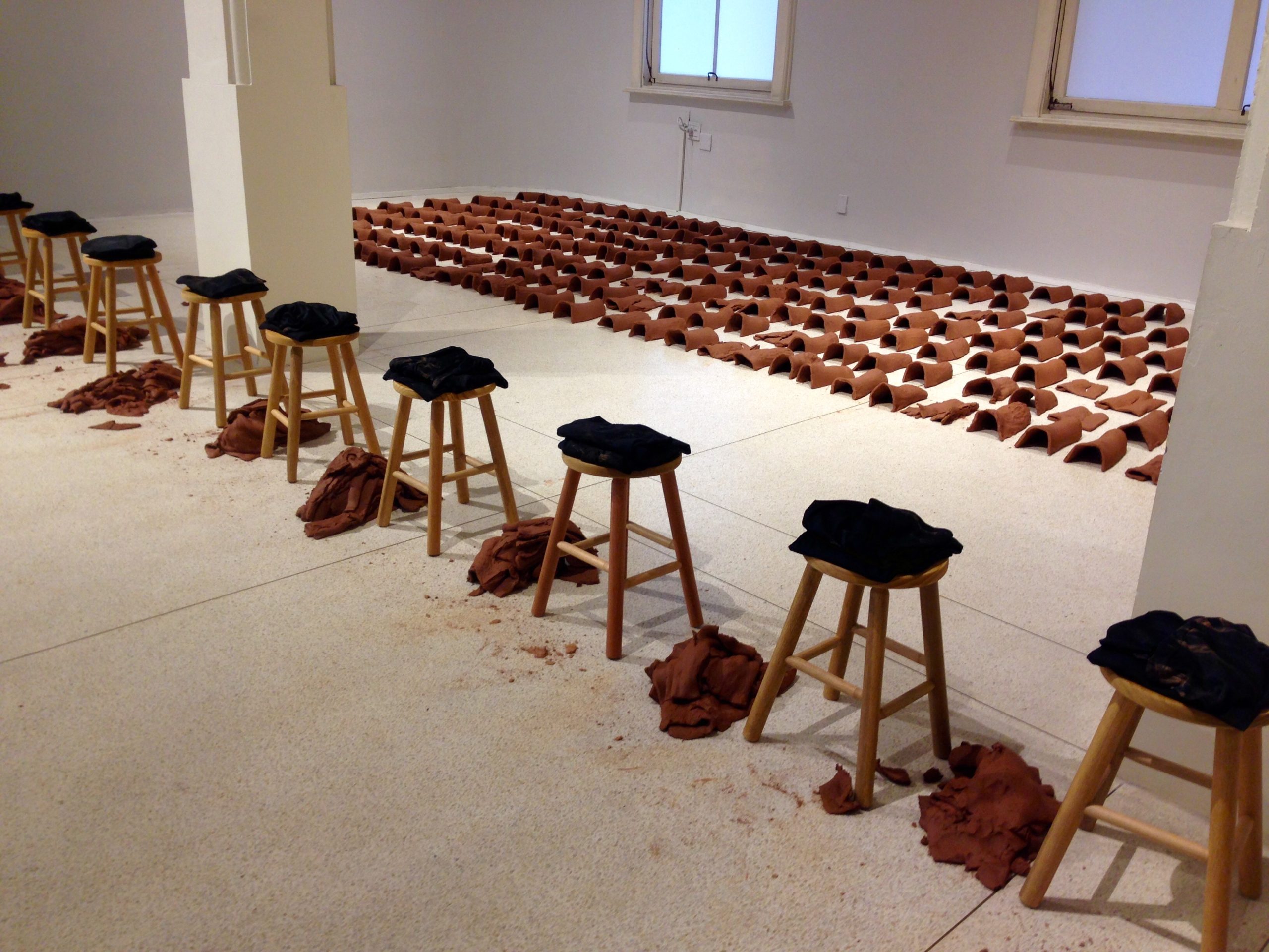 Nesse sentido, a mostra apresenta uma instalação, desenvolvida pela artista em colaboração com a dupla de arquitetos Francisco Rivas e Rodrigo Messina, que reúne dispositivos de acessibilidade e permanência pensados como parte constitutiva da obra. A intervenção reorganiza a recepção: a porta e o batente foram deslocados para permitir abertura total (180°); bancos e banquinhos foram distribuídos para acolher o repouso; e almofadas nos bancos externos estendem a experiência para o entorno.