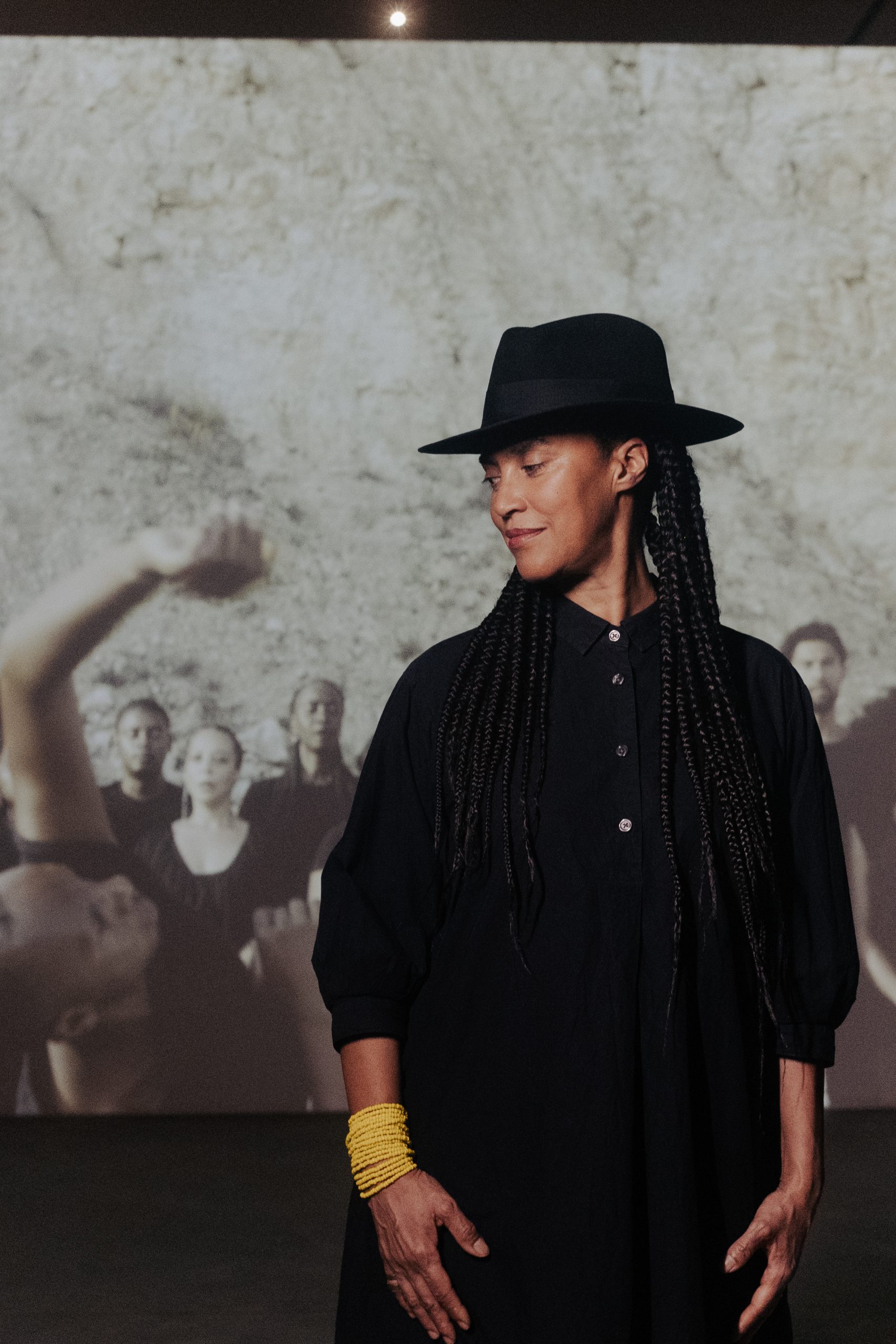 “Isso faz parte do meu conceito de trabalho, que tem essa dimensão de responsabilidade, de justiça. Como é que uma obra pode abarcar também uma comunidade, não só uma artista, não ficar centrado e ancorado numa pessoa só – isso é extremamente masculino e extremamente dominante, mas como mulher, artista da diáspora, eu tenho uma metodologia de trabalho que envolve não só o meu corpo, mas muitos outros corpos e muitas outras pessoas”, conclui.