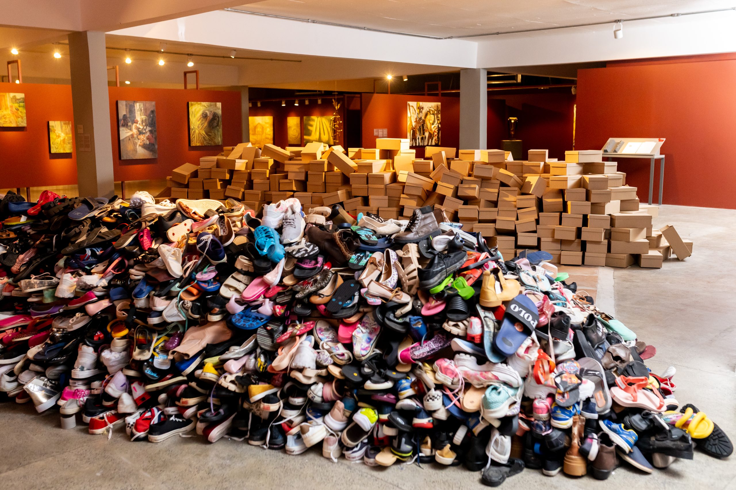 Já em Ritos de Passagem (1996), reuniu mil caixas de sapato vazias, dois mil sapatos gastos e pedras de lioz retiradas de uma calçada de Manaus. A remontagem das obras foi realizada por Regina Vater, artista, amiga e parceira de Evangelista, que contribuiu para manter viva a integridade de suas criações. Essa presença dupla, da memória de Evangelista e do gesto cuidadoso de Vater, reforça a dimensão afetiva e política da homenagem.