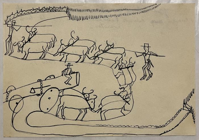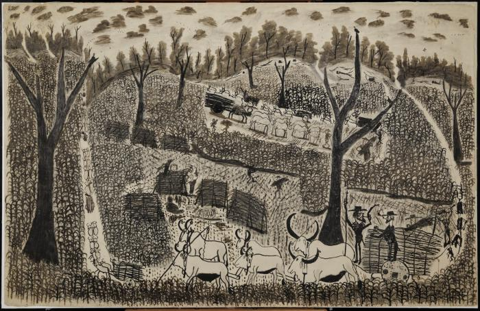 Também estão expostas outras obras em papel, nanquim e gouache. Entre eles estão Sucuri comendo boi, de 1958, e uma grande composição em nanquim, sem título, de 1950, que representa uma cena de campo em que dois homens conduzem carros de bois. “Procuramos dar destaque à diversidade de suportes da produção de Silva, mais conhecido por suas pinturas em tela, bem como mostrar que, em seus primeiros trabalhos, já se delineiam tanto seu estilo quanto sua poética e temáticas, mostrando um artista consciente de sua prática e interesses”, afirma Pitta.