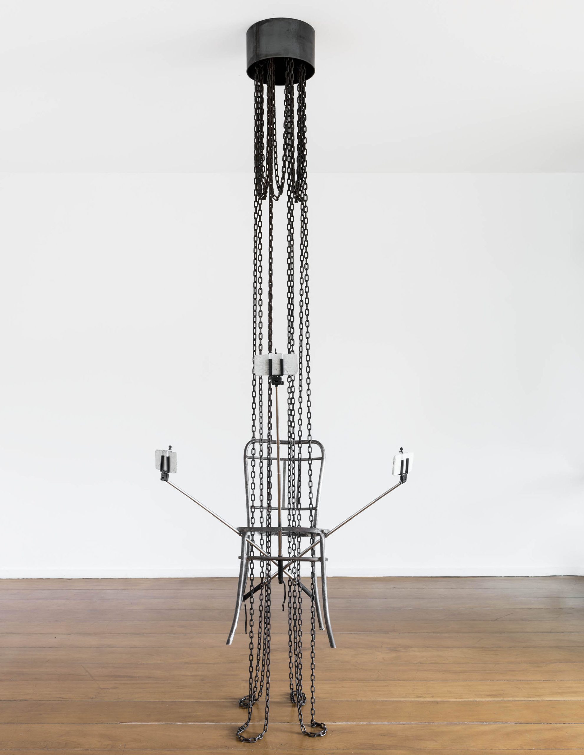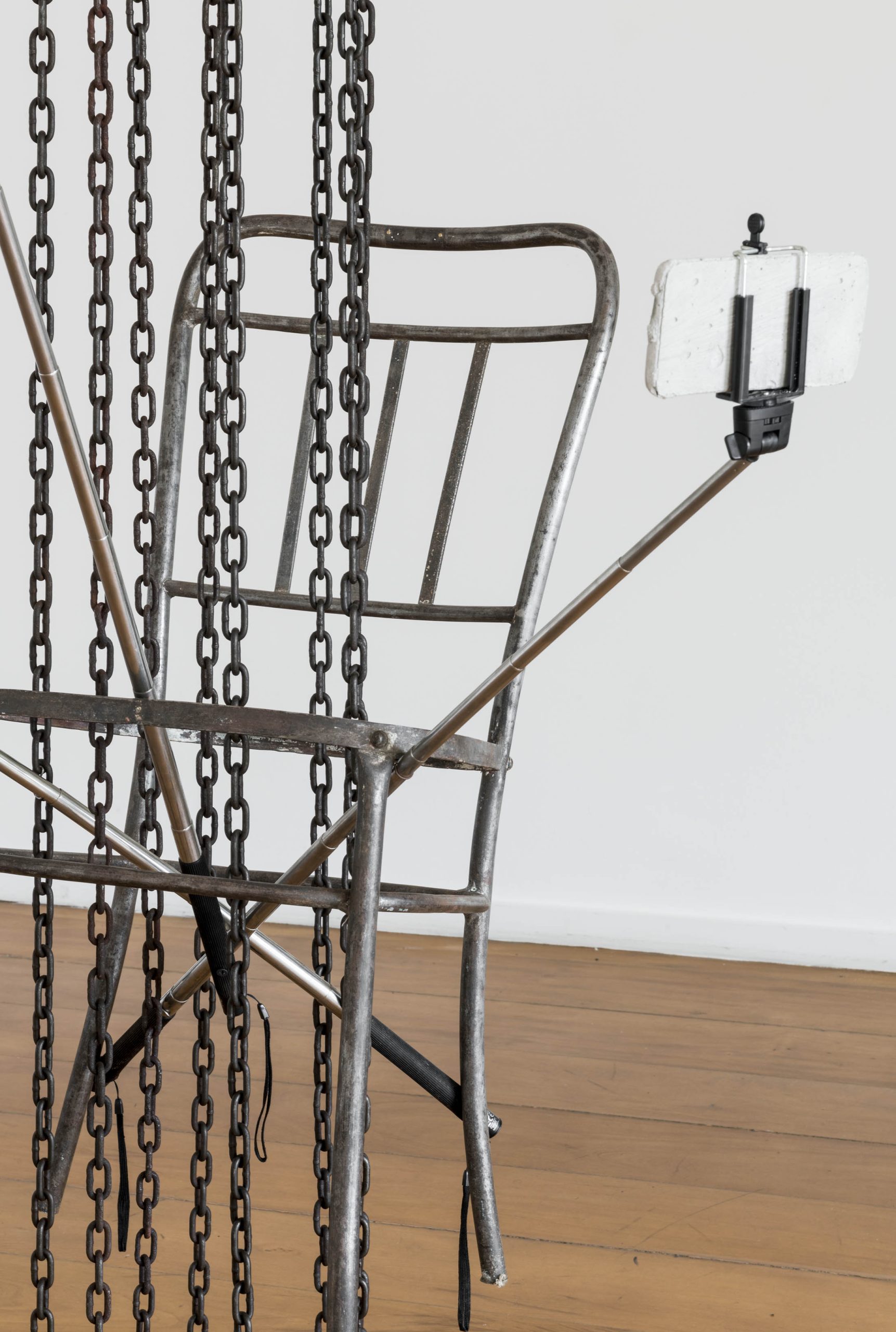 Para Cadeira Cativa, ele achou importante que as estruturas fossem todas montadas de metal. “Queria que tivesse essa coisa do metal que funciona como um esqueleto. Achei importante que esses elementos fossem, num certo sentido, sem carne”. Ele explica que existe um corpo que não está ocupando aquele espaço, ao qual ele se refere como um “fantasma do autoritarismo”. Ao mesmo tempo, demonstra, esse fantasma estaria a ponto de ser deposto, já que com a ausência dos celulares que compõem a instalação a cadeira viraria, derrubando o corpo que estivesse nela. Sendo assim, os celulares seriam o que dá holofotes para o autoritarismo.