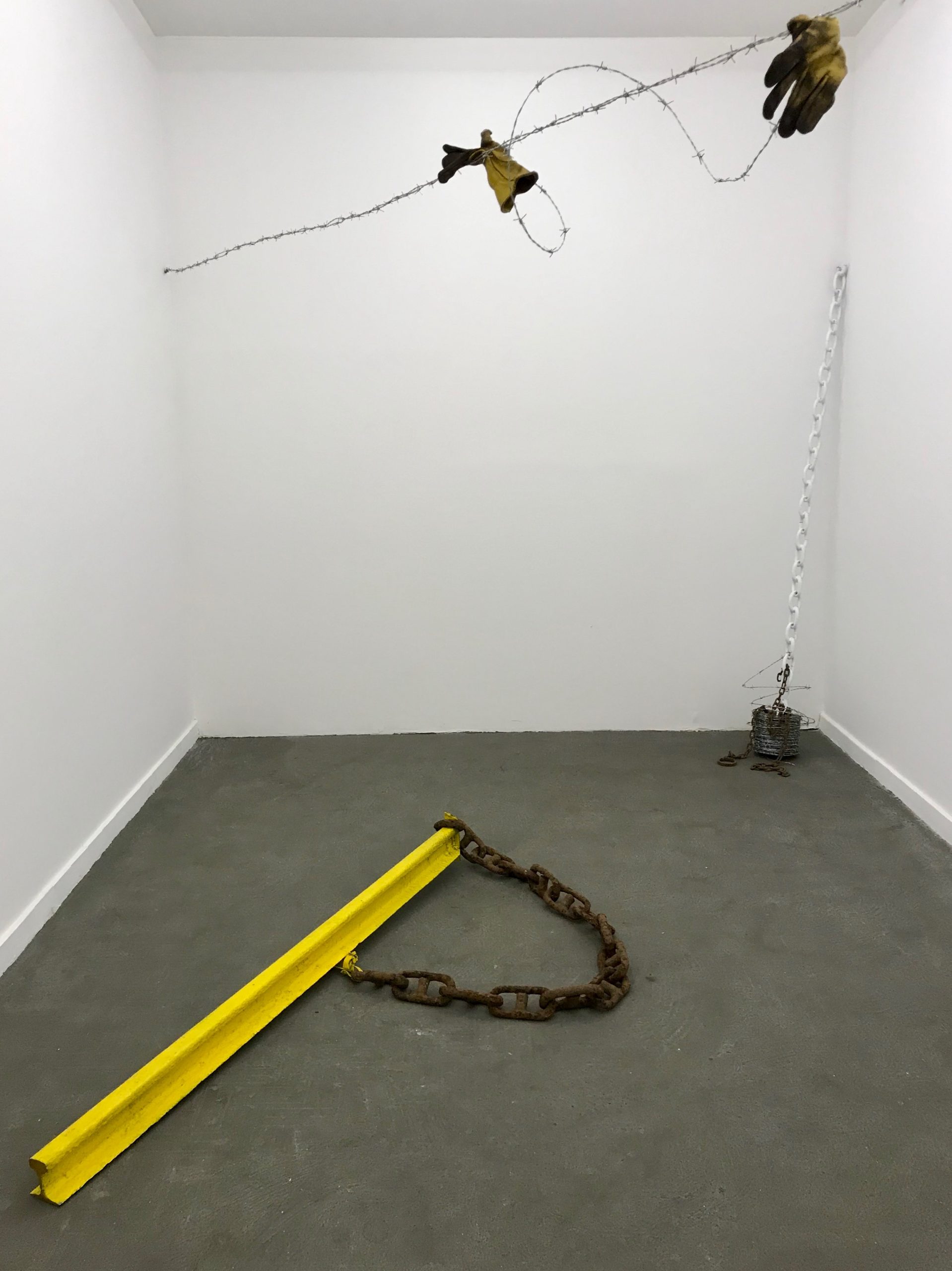 Na entrada do espaço expositivo, um caminho de espadas de São Jorge e Iansã, conduzem até um novo objeto instalativo: um altar com dois troncos que simbolizam o pelourinho. Os troncos estão inteiramente cravejados de pregos — em um deles, os pregos estão voltados para fora; no outro, para dentro — simbolizando proteção e punição e a dificuldade de harmonizar tensões. Entre os pelourinhos, cabos suspendem uma cabeça de bronze com um prumo na ponta. Esta instalação é uma oferenda ao senhor do caminho, portanto, tem uma relação com Exu.