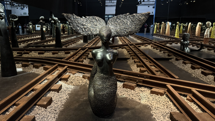 Na espaço expositivo, as sete direções representam Exu, enquanto os trilhos de trem remetem a Ogum, o orixá da tecnologia e dos caminhos. “Ogum é o orixá que descobre o ferro, que forja o ferro e cria as primeiras ferramentas. Ele adentra uma floresta densa e permite que a terra seja arada, cultivada e que também se atravesse para espaços para além daquela floresta.”