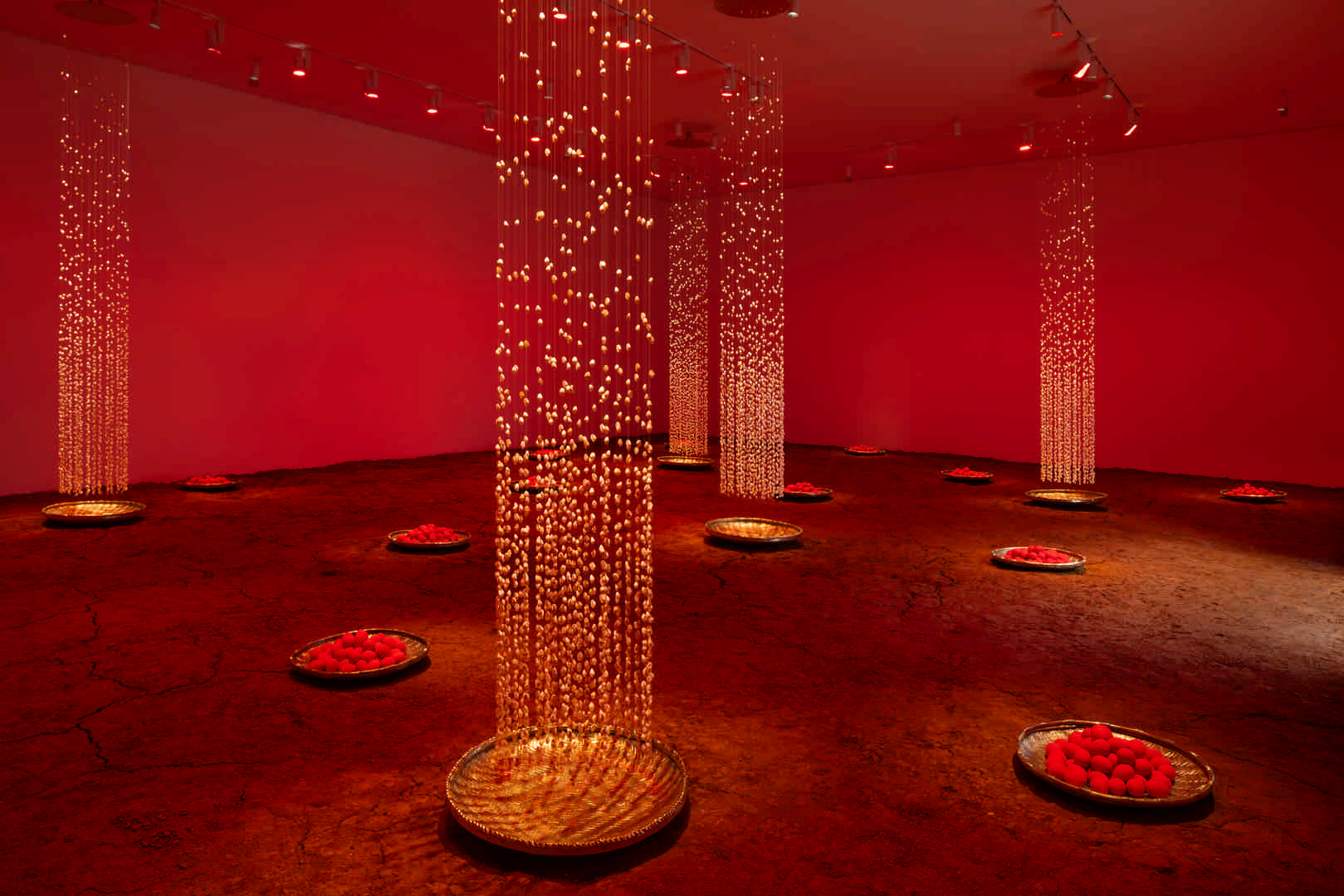 Uma instalação inédita, localizada em um espaço fechado, no fundo da galeria, se refere diretamente a ideia de jogo e de sorte. Nela, colunas de búzios se derramam sobre peneiras de bronze douradas, carregando ovos de cerâmica pintados de vermelho. Os búzios representam elementos de tentativa de leitura da sorte, do destino e da sina, e simbolizam a moeda de troca, que também se transforma em oferenda. Na disposição que se encontram no espaço, os búzios formam colunas que estão ascendendo, como um território de elevação espiritual e de ressignificação da vida ante ao que ela propõe de fatal.