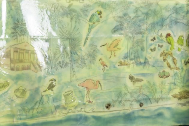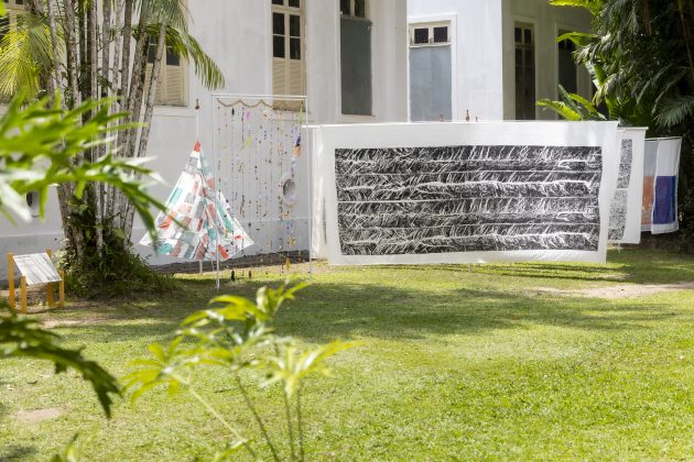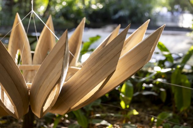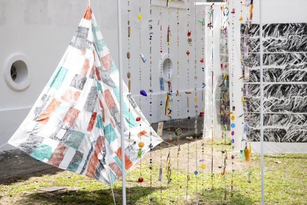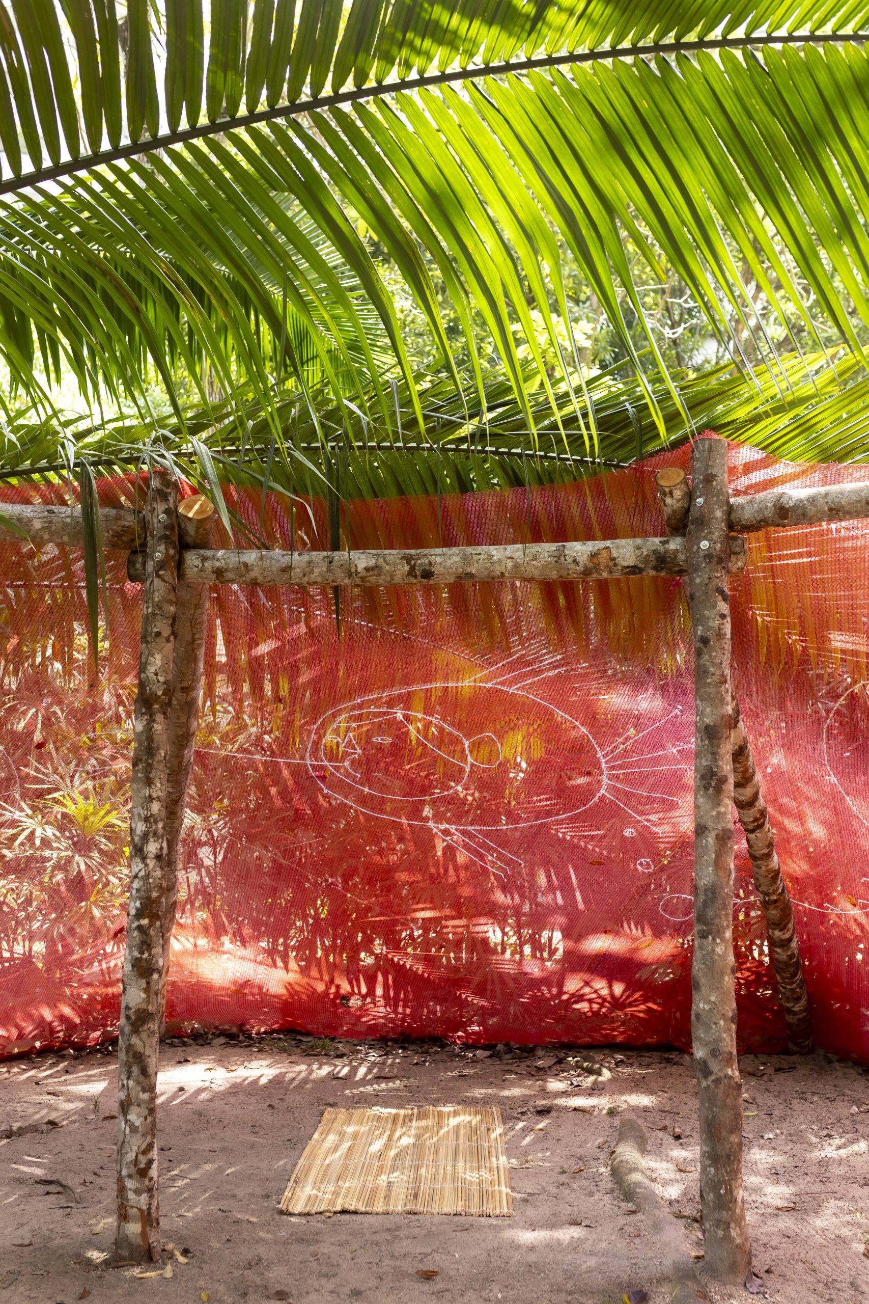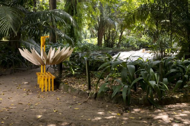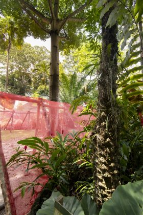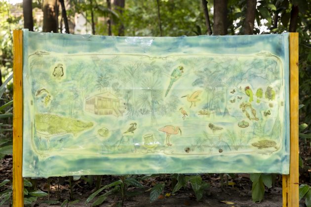 Também interessado na dimensão simbólica da natureza, Gustavo Caboco, do povo Wapichana, apresenta Casa de bicho e Antibatismo: Victoria Regia. Diante da samaúma que abriga sua instalação, ele explica que em Roraima, a árvore é chamada de casa de bicho, porque é também casa de espíritos. No contexto do parque, o nome ganha novo sentido: “Aqui no museu acaba se tornando essa casa de vários bichos, né?”. Caboco reflete sobre como um parque, apesar de não ser uma floresta, nem se parecer com uma, talvez seja o mais próximo que a gente chegue “dessa ficção do que seria uma floresta na cidade. Mas tem uma distância, né? Então, lembrar da casa de bicho é isso”.