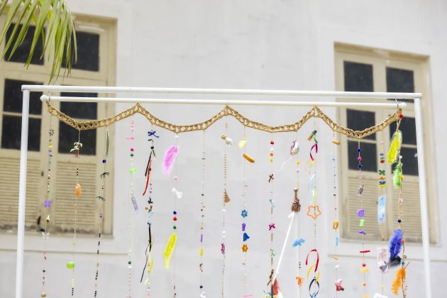 Entre os artistas convidados, Rafael Segatto vê no encontro entre arte e ciência uma afinidade profunda. “Eu estou muito feliz de estar com esse trabalho no Goeldi porque é uma instituição das mais antigas do Brasil e ela tem um foco em ciência e em educação. Isso enquanto artista me interessa muito porque o meu trabalho tem uma série de atravessamentos nessas áreas”, diz. Filho de pescadores, o artista reconhece na água o elo que costura dimensões materiais e espirituais. Ao observar o ambiente, comenta sobre as penas de urubu espalhadas ao redor: “Qual museu tem urubus?”, questiona. No parque, eles habitam a samaúma próxima à sua instalação, e essa convivência interespécie, segundo ele, é parte do próprio trabalho. “Os urubus são seres importantes para o ciclo, sendo decompositores. Eles contribuem, trabalham junto comigo”, completa.
