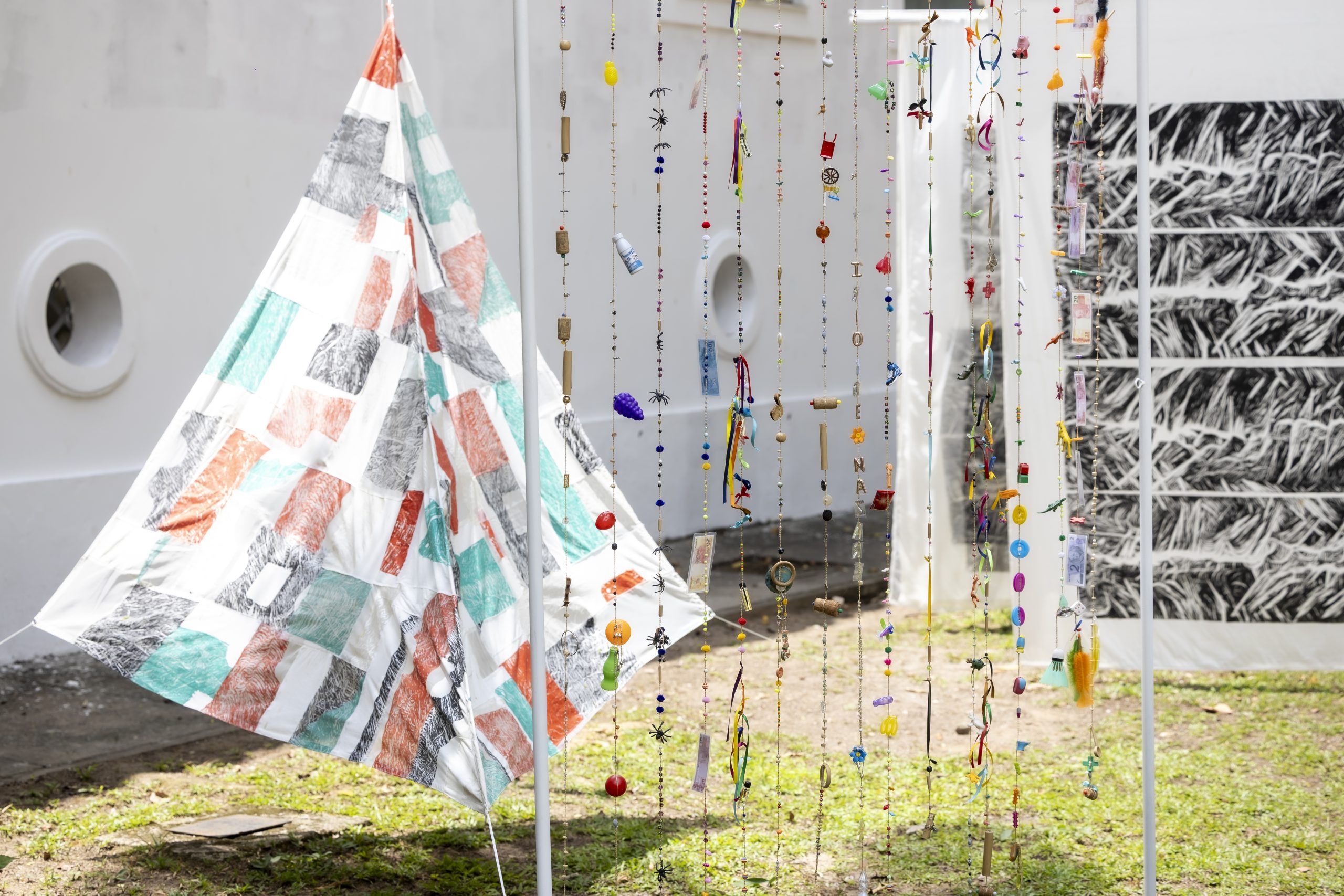 Em Entoar o vento e dançar marés, Elaine Arruda volta ao rio Tijucaquara, no Marajó, onde nasceu sua avó. “É um rio que a minha vó saiu com 12 anos de idade e veio para Belém com a família para estudar. Ela nunca mais tinha voltado. Então, quando ela fez 80 anos, eu dei de presente para ela uma viagem de retorno a essas águas.”, relata. A viagem, inicialmente familiar, tornou-se o ponto de partida para um trabalho sobre memória e território. “Você chega lá, não tem nada. Você tem um rio na sua frente para você tomar banho. Você só sai de lá quando a maré enche”. A artista traduz essa experiência em uma instalação que convoca o corpo e a lembrança como modos de pertencimento.