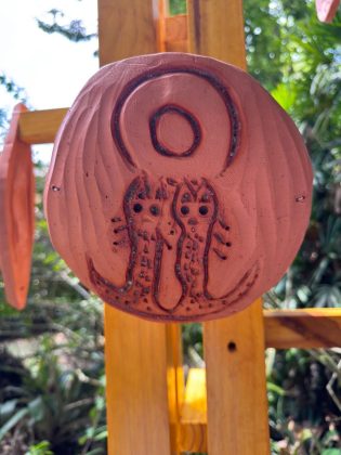 O paraense Francelino Mesquita traz à mostra um elo entre cultura popular e preservação ambiental. Suas esculturas em miriti — matéria-prima tradicional dos brinquedos de Abaeté— derivam de uma prática reconhecida como patrimônio cultural. “A partir de 1999 decidi ressignificar, experimentar essa utilização desse Meriti de forma diferente. Trazer para as artes plásticas, trazer de uma forma mais natural para o público”, conta. O gesto de levar o material natural, sem pintura, para o espaço expositivo é, para ele, um modo de afirmar a vitalidade de um saber ancestral.